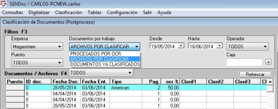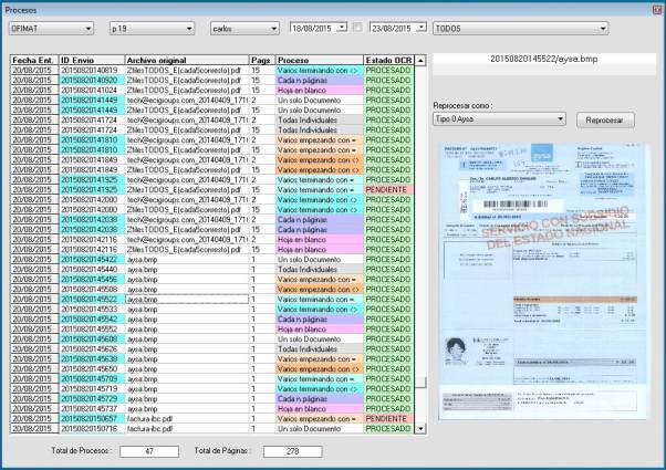 Mediante colores se señala el grado de acierto mediante OCR de la identificación del documento como así también la cantidad de datos leídos del documento; todo esto para facilitar la tarea de clasificación posterior si fuera necesaria. |